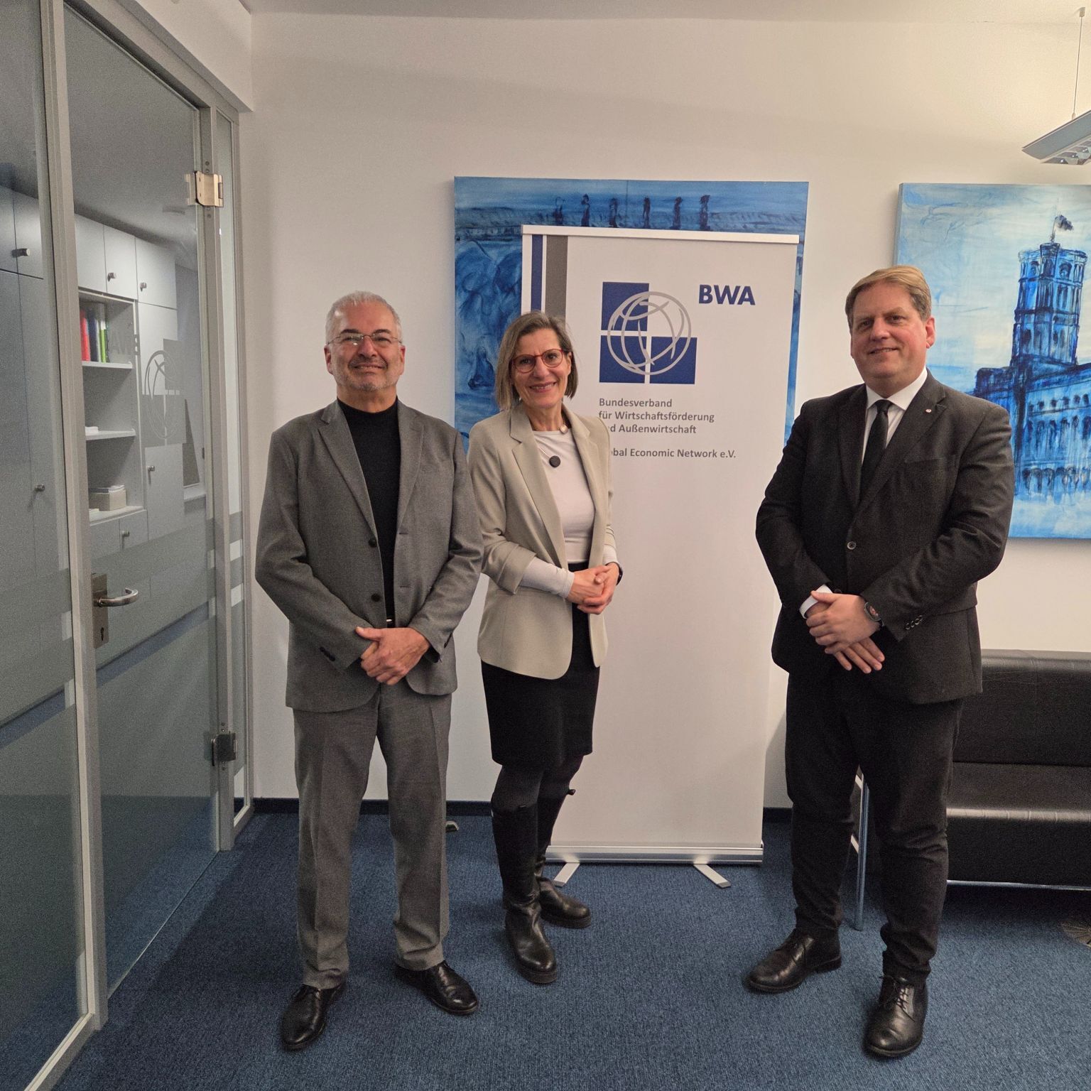 Beim Bundesverband für Wirtschaftsförderung und Außenwirtschaft (BWA) trafen sich Marion Sodemann, Geschäftsführerin des Senior Expert Service (SES), BWA-Bundesgeschäftsführer Andreas Hube und Claus Treppte, Leiter der Bundesfachkommission Stadtentwicklung, Architektur, Gebäudetechnik, zu einem Arbeitsgespräch.