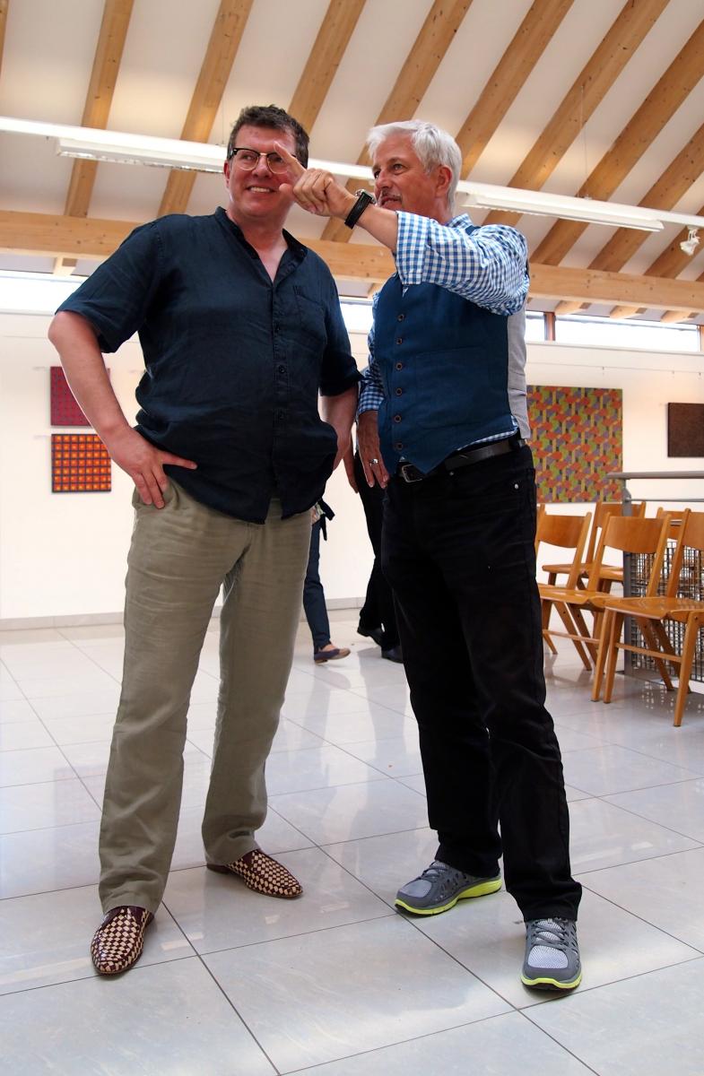 Abt Präses Jeremias Schröder OSB (rechts) und Pater Dr. Cyrill Schäfer, Leiter der Galerie und des EOS-Verlages (links) vor den Werken von Karl Heinz Kappl